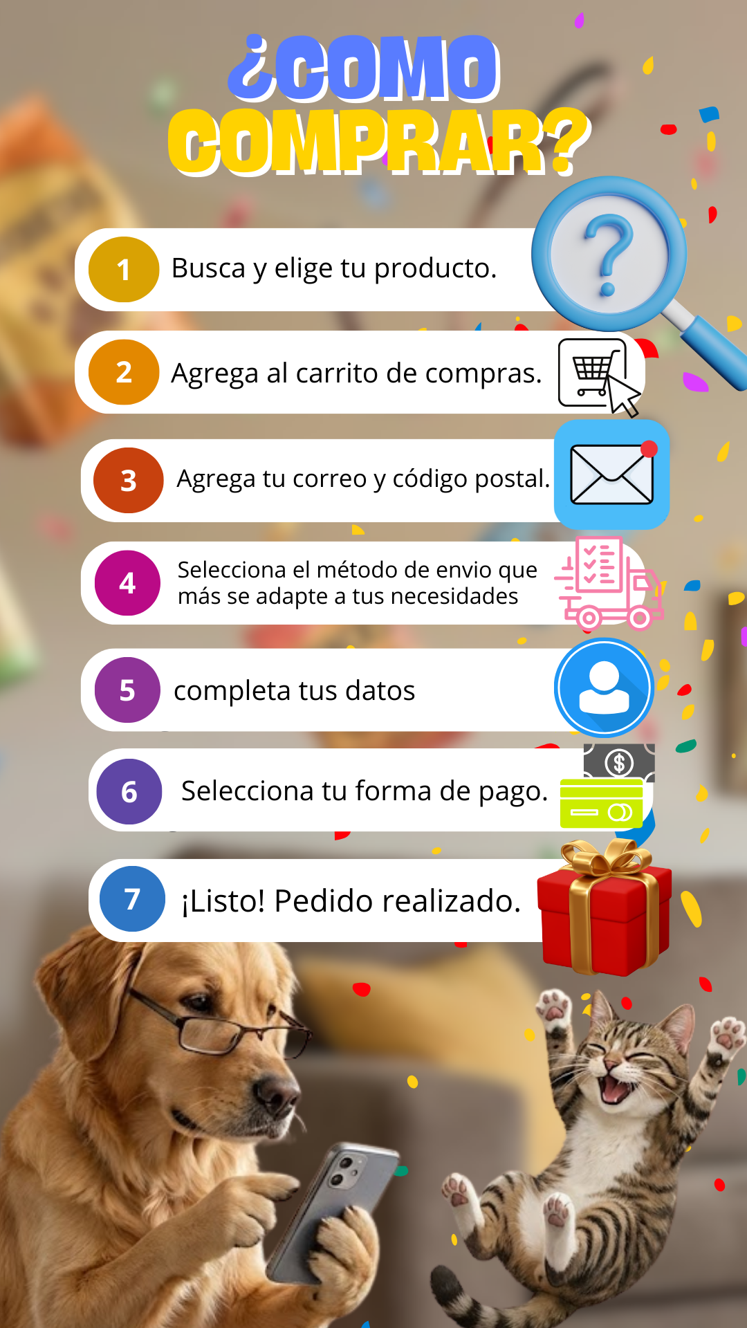 Realizar tu pedido en nuestra tienda en línea es muy sencillo y seguro. Hemos diseñado un proceso rápido para que tus peluditos reciban sus productos favoritos sin complicaciones. Si tienes alguna duda durante tu compra o necesitas asesoría personalizada, puedes contactarnos en cualquier momento haciendo clic en el icono de WhatsApp.