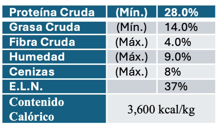 Harina de carne de res, arroz, maíz, carne de pollo, harina de carne de pollo, concentrado de proteína vegetal, grasa de pollo, pulpa de remolacha, semilla de linaza, harina de pescado, sabor natural de pollo, fósforo, calcio, sodio, extracto de raíz de achicoria, cloruro de colina, levadura hidrolizada (Saccharomyces cerevisiae activa 10x1010), lisina, acetato de retinol (fuente de vitamina A), colecalciferol (fuente de vitamina D), acetato de DL- alpha tocoferol (fuente de vitamina E), menadiona nicotinamida bisulfato (fuente de vitamina K), ácido ascórbico (fuente de vitamina C), mononitrato de tiamina (fuente de vitamina B1), riboflavina (fuente de vitamina B2), ácido nicotínico (fuente de vitamina B3), clorhidrato de piridoxina (fuente de vitamina B6), cianocobalamina (fuente de vitamina B12), D-biotina (fuente de vitamina H), D-pantotenato de calcio (fuente de vitamina B5), ácido fólico, hierro orgánico, manganeso orgánico, selenio orgánico, cobre orgánico, zinc orgánico, EDDI, extracto de Yucca schidigera, mezcla de romero y tocoferoles como conservadores.