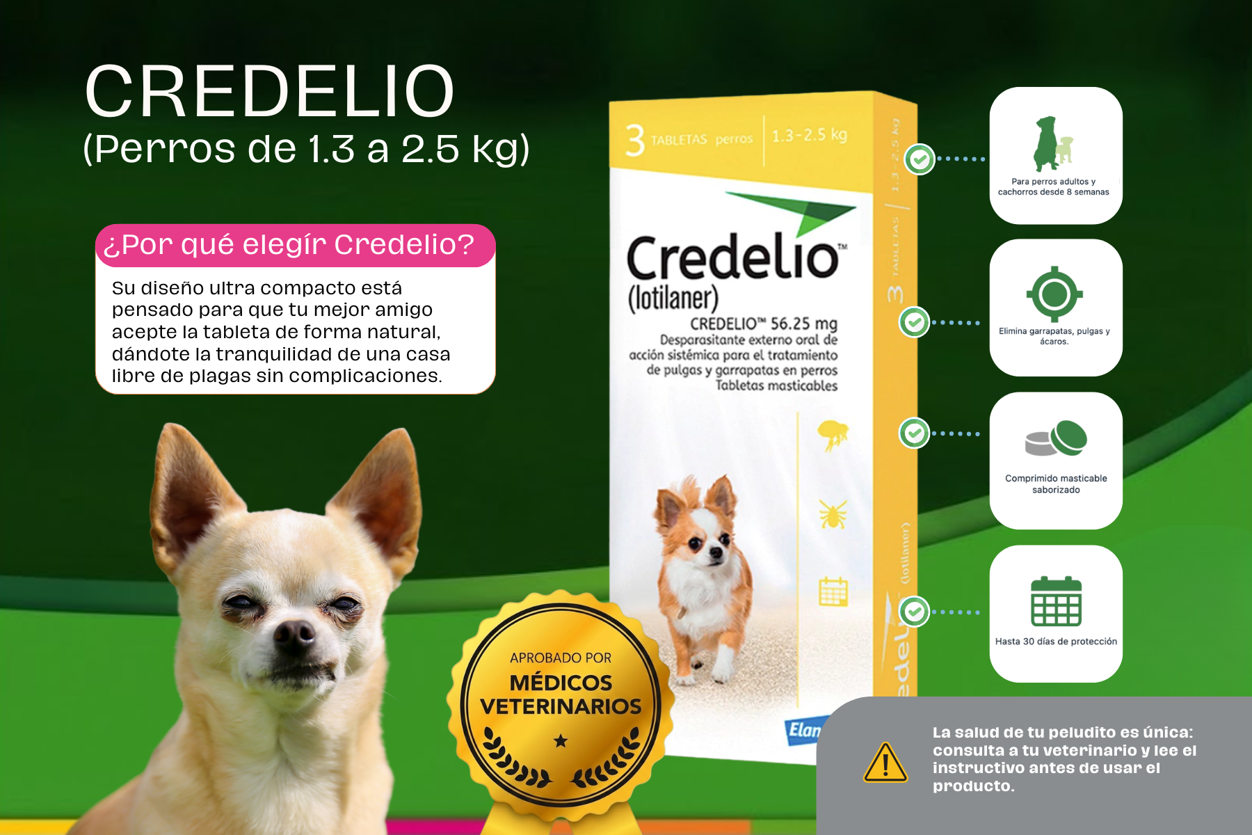 Credelio está disponible en 5 presentaciones para perro y 2 para gato, pregunta al médico veterinario por la presentación ideal dependiendo del peso de tu mascota, la caja contiene 3 tabletas que lo protegerán hasta por 3 meses continuos, se recomienda administrar una tableta mensualmente.