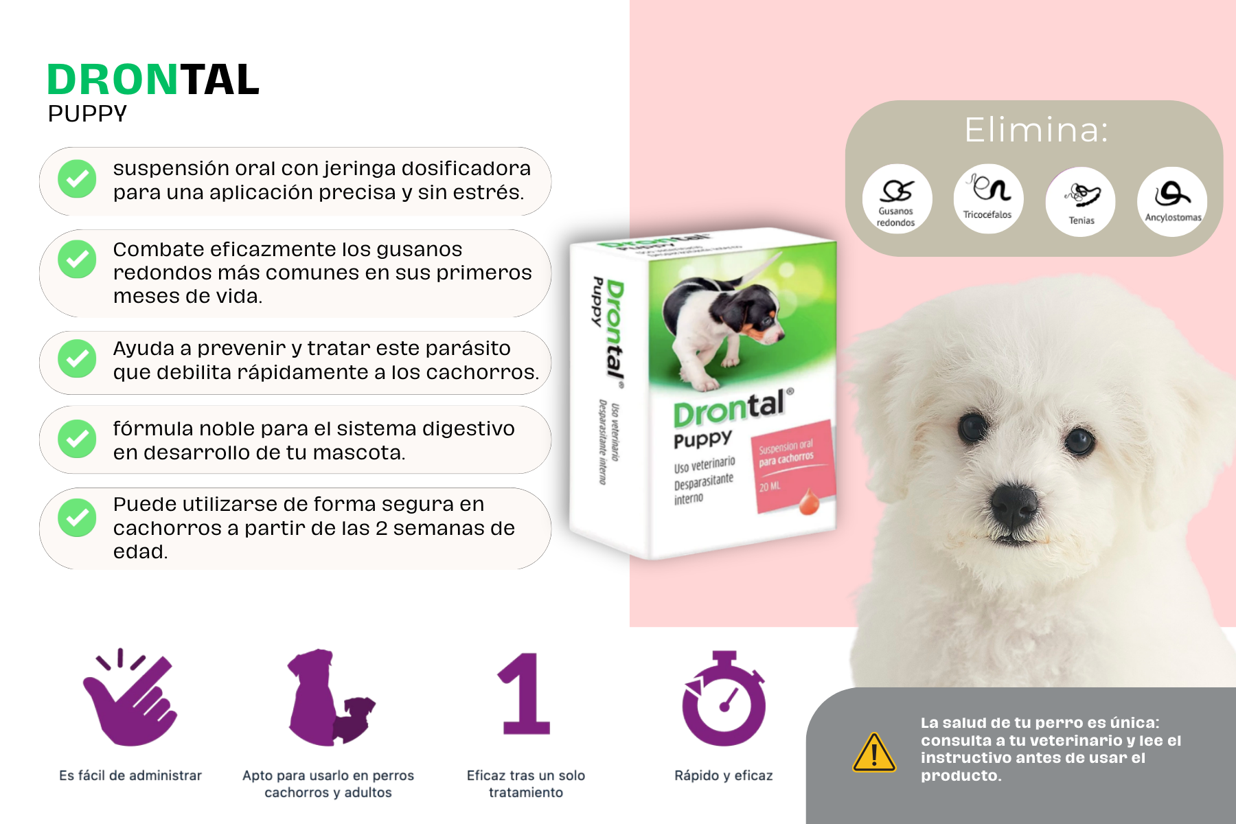 DRONTAL PUPPY es un desparasitante de amplio espectro, diseñado para proteger a cachorros y perros jóvenes de los principales parásitos intestinales. Con una fórmula innovadora este producto ofrece una saolución eficaz y segura para el bienestar de tu mascota.