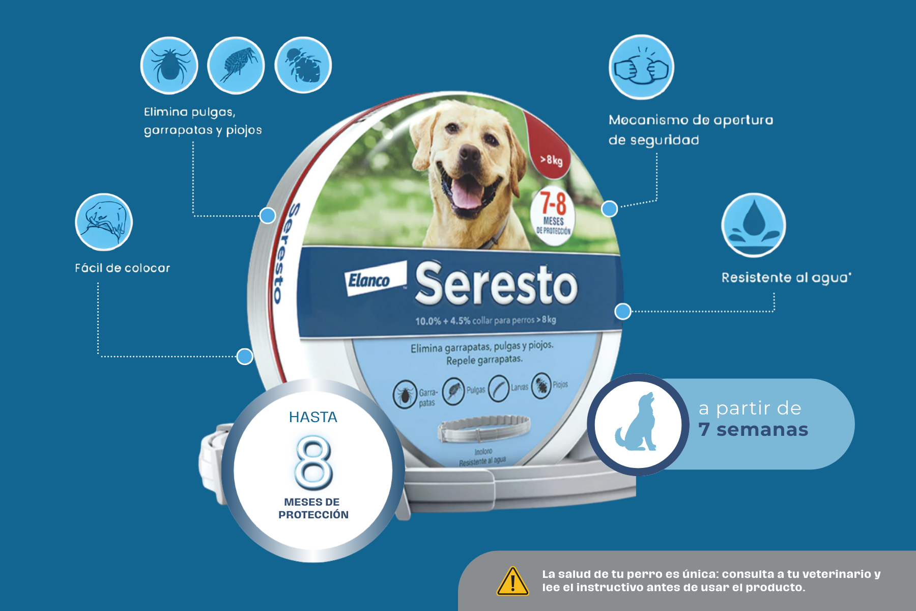El collar antipulgas y antigarrapatas Seresto es un collar sin igual que provee protección prolongada contra pulgas y garrapatas durante un periodo de hasta 8 meses. Es capaz de matar pulgas y garrapatas al contacto así que no es necesario que estos parásitos piquen a tu mascota para que se mueran.