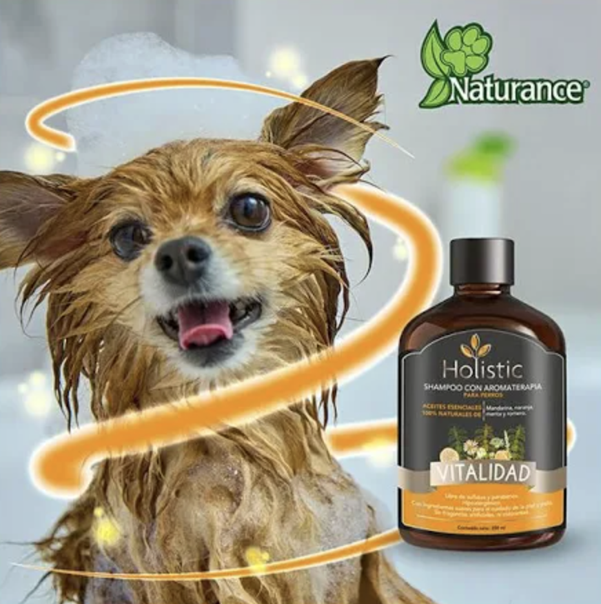 El Shampoo con Aromaterapia VITALIDAD de la línea Holistic puede usarse cuando tu mascota está cansada o decaída. Brindando un baño de ánimo, fuerza y alegría. No irrita la piel del perro y deja un agradable aroma relajante para tu mascota.