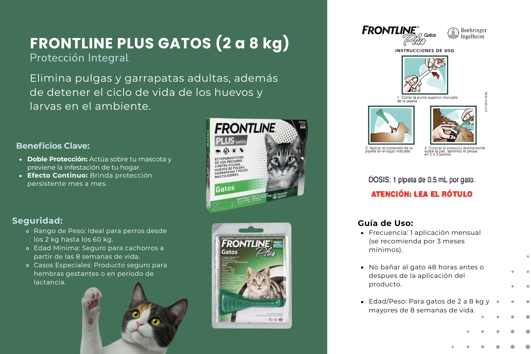 - Puede ser utilizado en cachorros con más de 8 semanas de vida o peso superior a 2 kilos