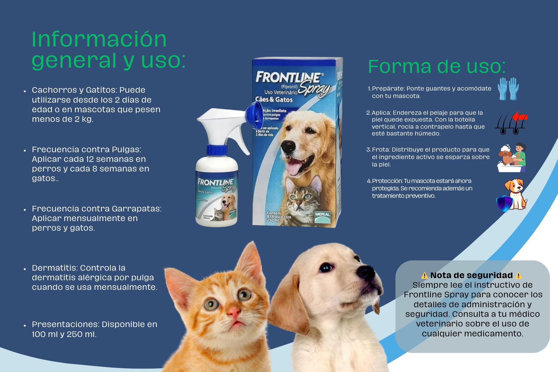 - Siempre lee el instructivo de Frontline Spray para conocer los detalles acerca de su administración y seguridad