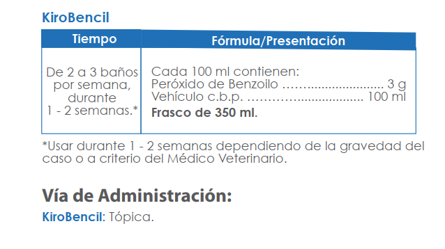 El shampoo KiroBencil funciona como astringente, queratolítico, cicatrizante y drenador folicular, está indicado para el tratamiento de: Prurito, seborrea, pioderma superficial, pioderma secundario profundo, pioderma crónico, acné felino y canino, costras, escamas y síndrome de comedones. Funciona como auxiliar en infecciones por Staphylococcus intermedius.