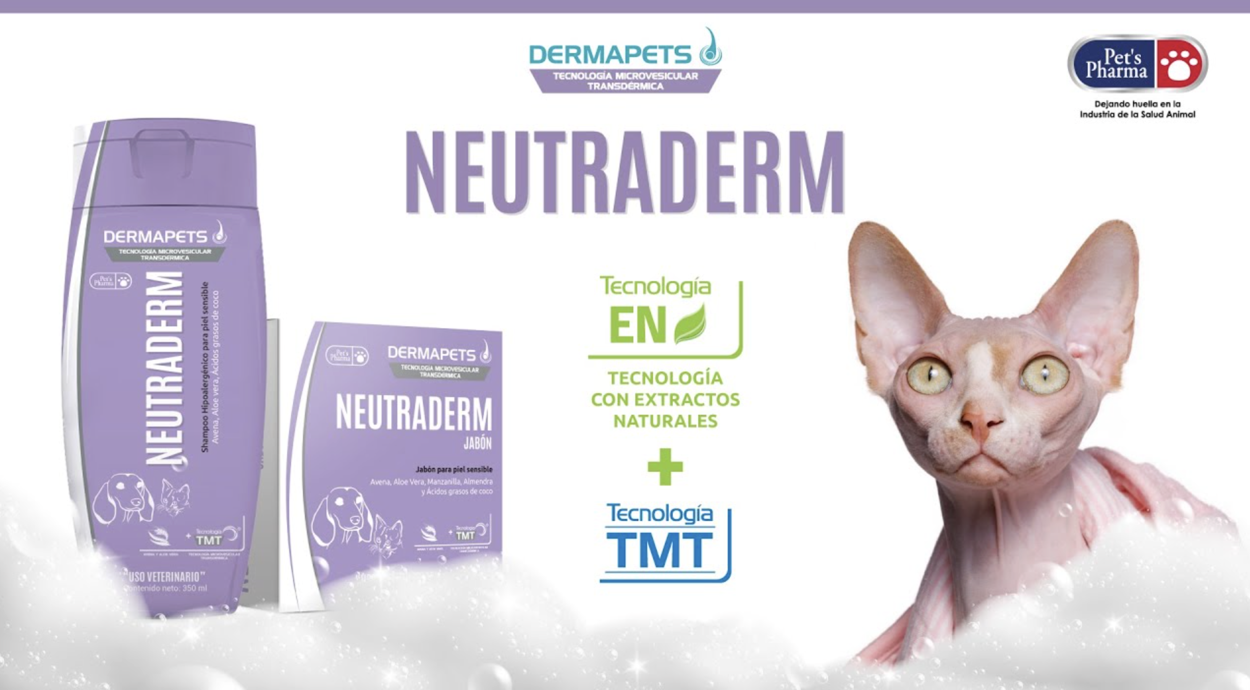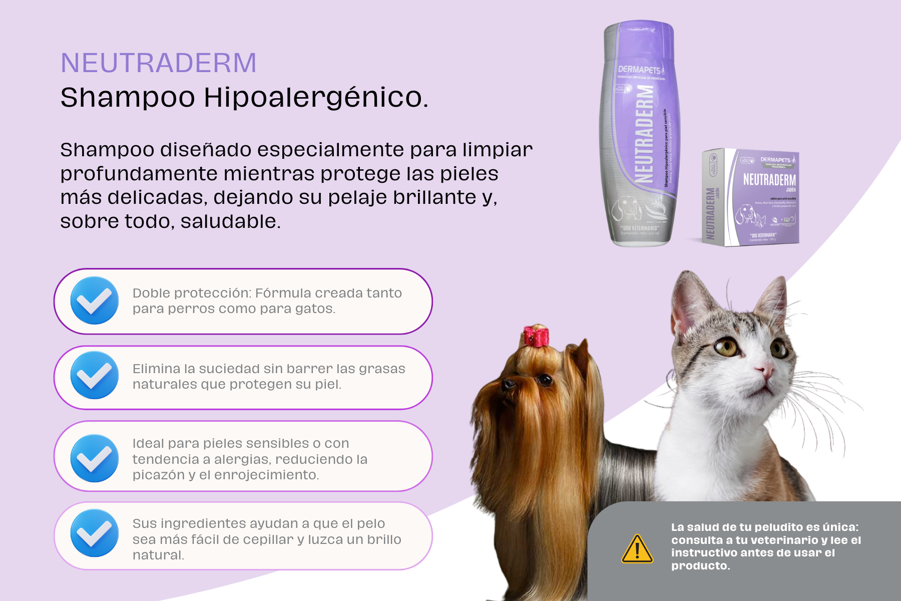 NEUTRADERM es un shampoo hipoalergénico que está indicado para cualquier tipo de pelo con la finalidad de hidratar y humectar la piel, proporciona al pelo brillo y sedosidad para un mejor manejo.