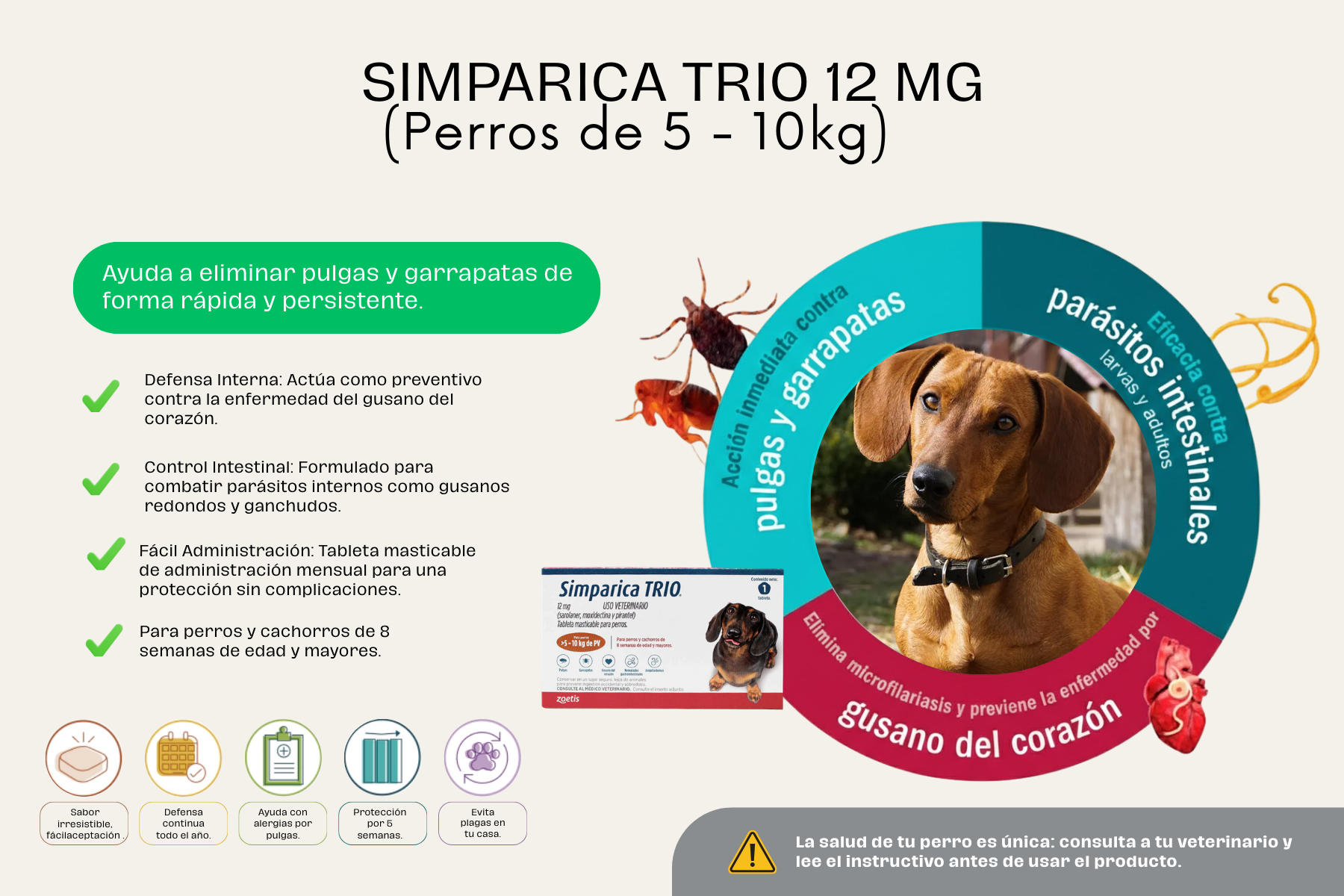 Simparica Trio está disponible en 5 presentaciones para ser administrada de acuerdo con el peso de tu peludo. El tamaño de la pastilla es proporcional al tamaño del perro, así no hay problema de que el perro no se la coma.