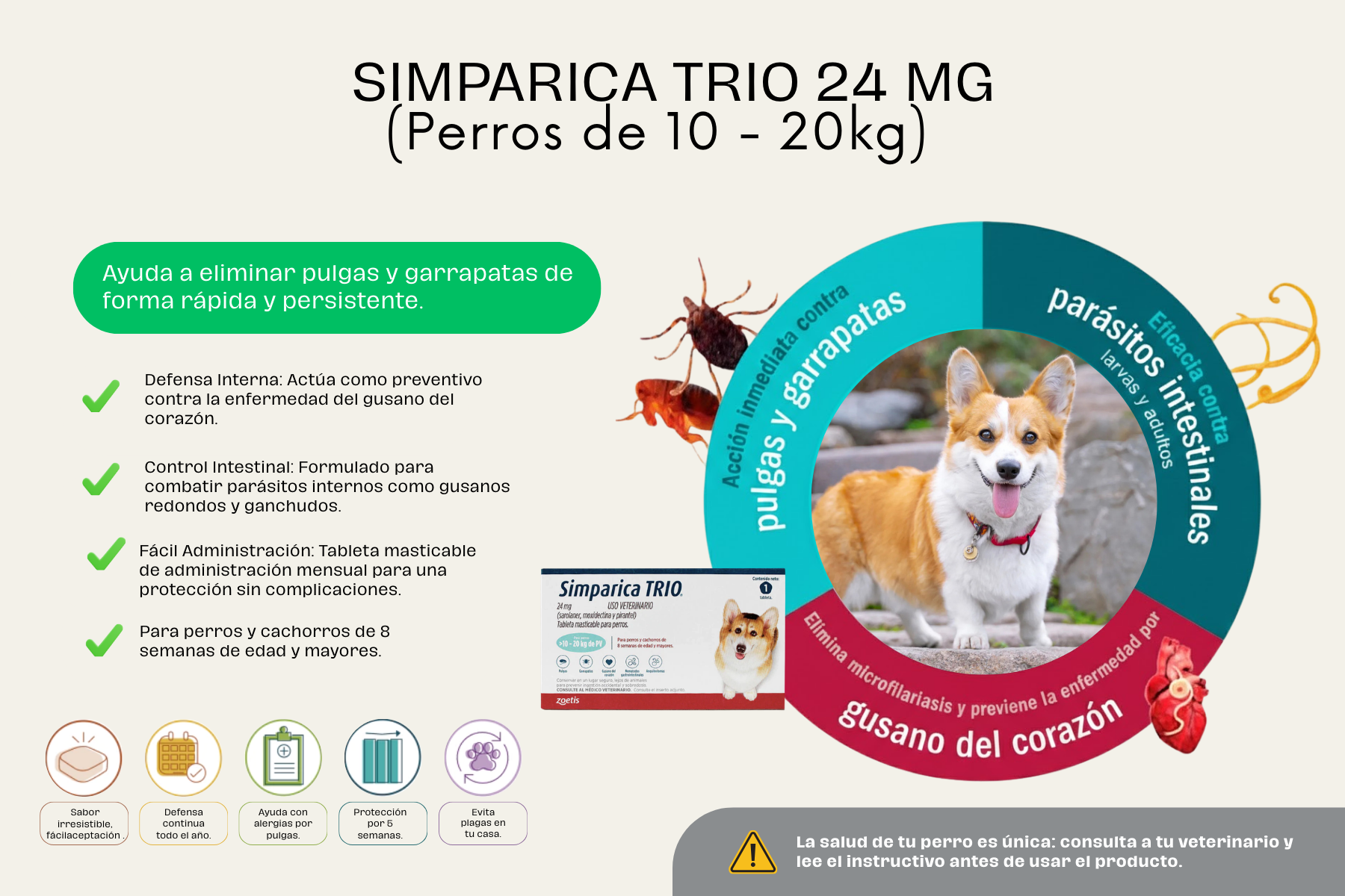 - Elimina y previene la enfermedad por el gusano del corazón