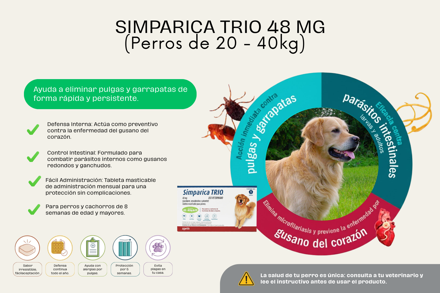 Simparica Trio está disponible en 5 presentaciones para ser administrada de acuerdo con el peso de tu peludo. El tamaño de la pastilla es proporcional al tamaño del perro, así no hay problema de que el perro no se la coma.
