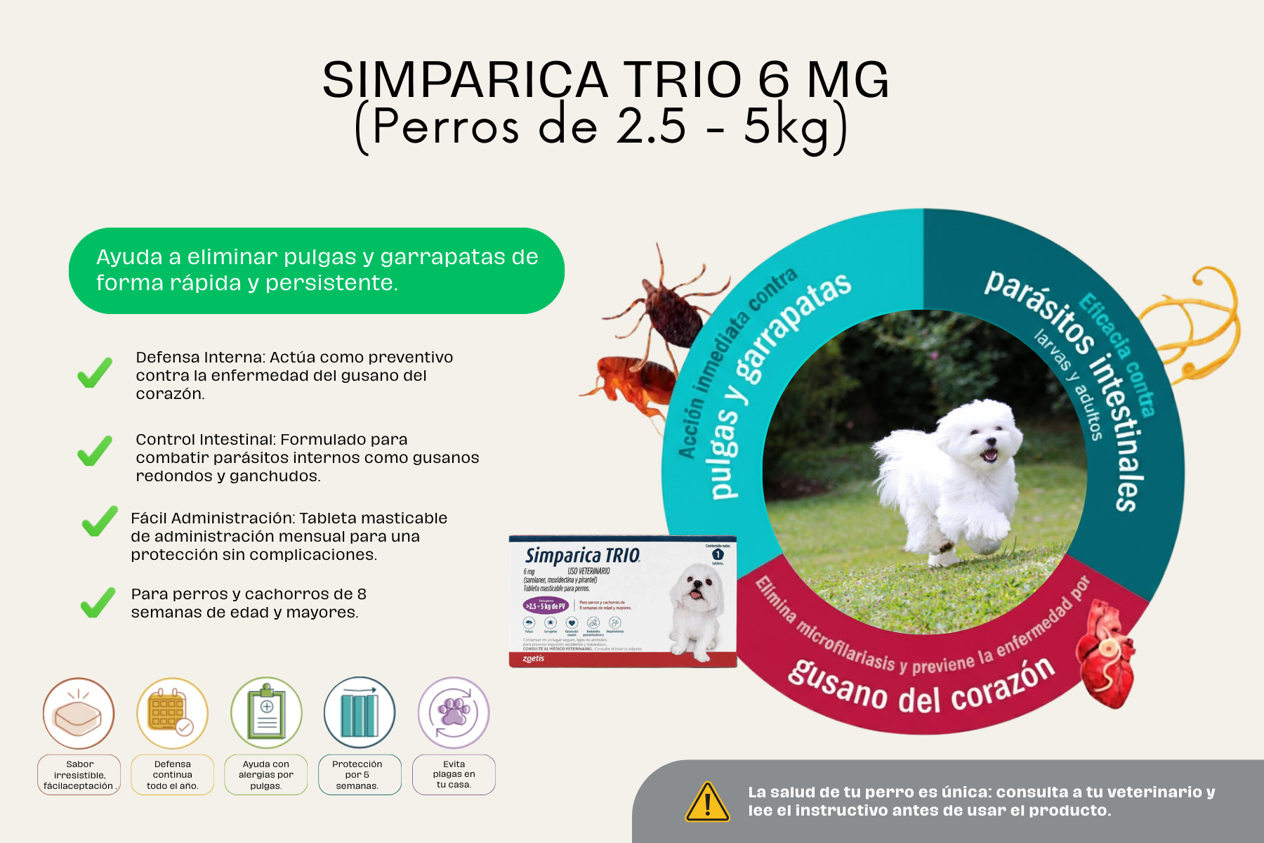 Simparica Trio está disponible en 5 presentaciones para ser administrada de acuerdo con el peso de tu peludo. El tamaño de la pastilla es proporcional al tamaño del perro, así no hay problema de que el perro no se la coma.
