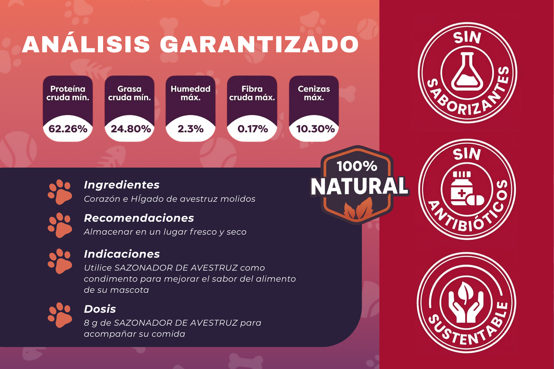 Trocitoz son premios naturales para perros, este sazonador está elaborado con hígado y corazón de avestruz pulverizados, diseñado para mejorar el sabor de las croquetas y aportar nutrientes reales de carne a la alimentación diaria de tu mascota. Este topper es ideal para perros que son selectivos con su comida, y que han perdido interés en las croquetas o que necesitan un refuerzo nutricional natural. Al espolvorearlo sobre el alimento habitual, cada comida se vuelve más atractiva y nutritiva.