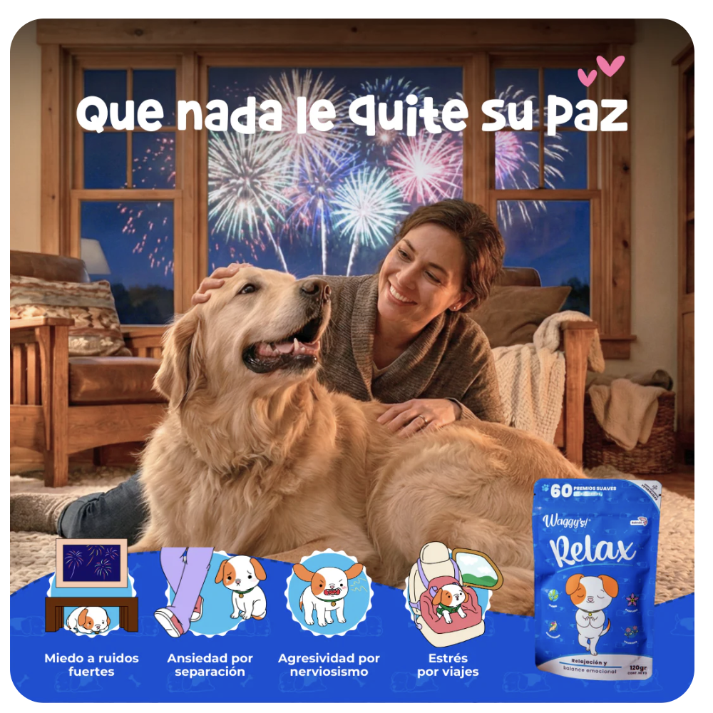 El calmante Relax de la marca Waggy´s está formulado con ingredientes naturales como té verde. Estos componentes, conocidos por sus propiedades relajantes, ayudan a tu mascota a manejar el estres y la ansiedad causados por ruidos fuertes, viajes y ansiedad por separación.