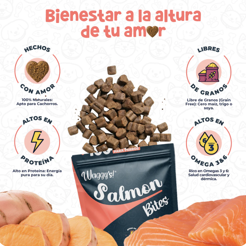 Los premios suaves de Waggy´s, receta de salmón y camote para perro, son la golosina ideal para consentir a tu peludito. Están elaborados con ingredientes 100% naturales, libres de granos y sin conservadores artificiales, lo que asegura un sabor irresistible y todos los beneficios que tu perro necesita. Además de ser deliciosos, proporcionan un alto contenido de proteínas de calidad superior y ácidos grasos esenciales que favorecen la salud de su piel, pelaje, articulaciones y sistema cardiovascular. ¡Perfección en un solo bocado!