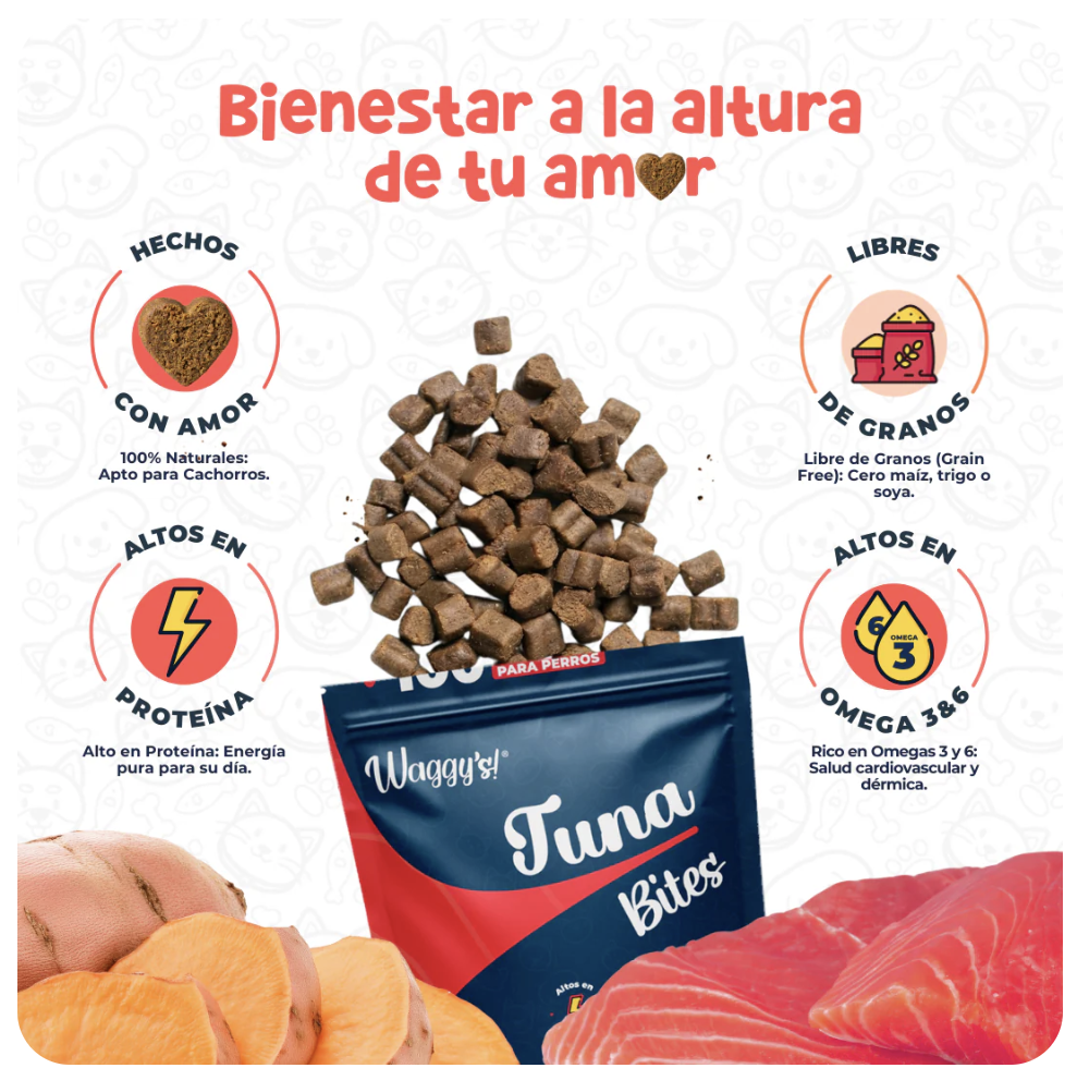 Los premios suaves de Waggy´s, receta de atún y camote para perros, son la golosina ideal para consentir a tu perrito. Están elaborados con ingredientes 100% naturales, libres de granos y sin conservadores artificiales, lo que asegura un sabor irresistible y todos los beneficios que tu perro necesita. Además de ser deliciosos, proporcionan un alto contenido de proteínas de calidad superior y ácidos grasos esenciales que favorecen la salud de su piel, pelaje, articulaciones y sistema cardiovascular. ¡Perfección en un solo bocado!