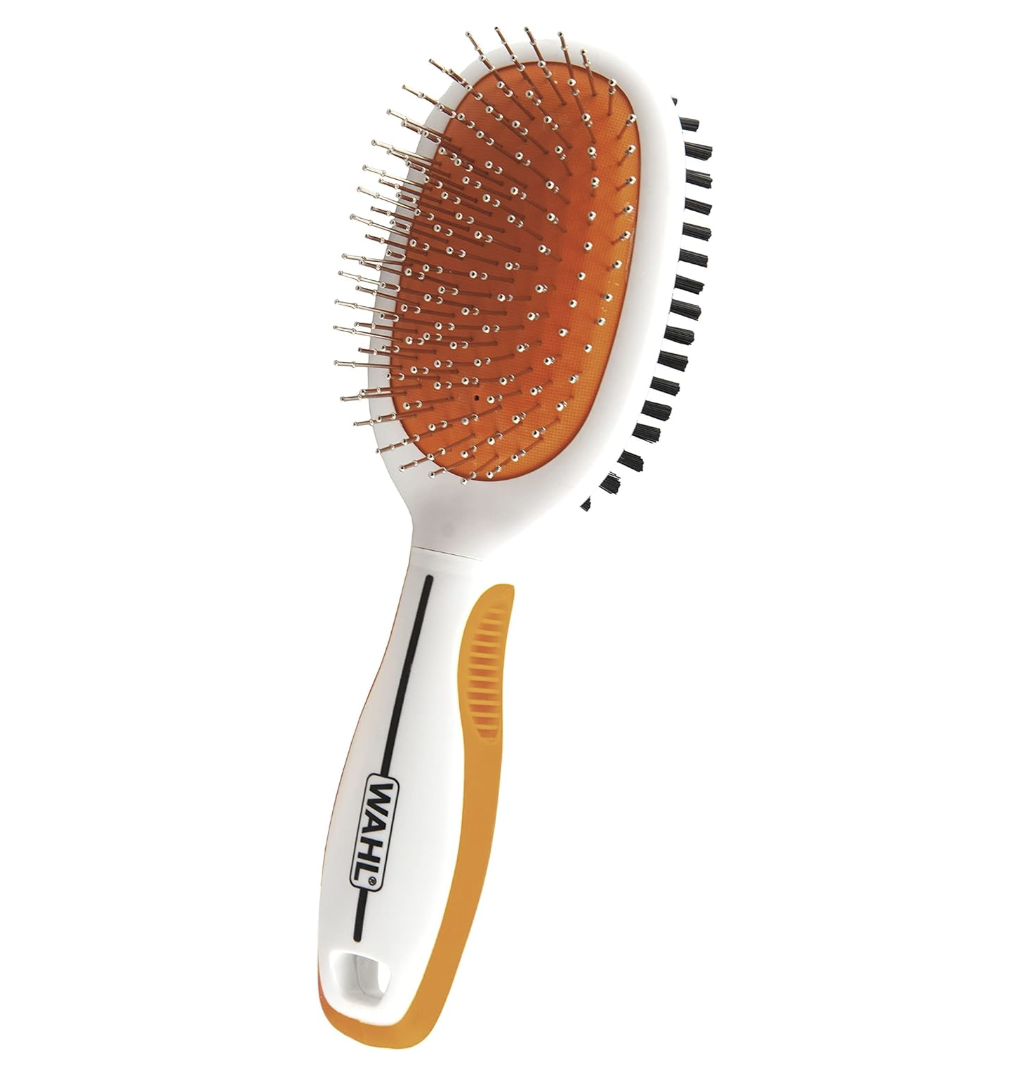 El cepillo de doble cara cuenta con dos lados diferentes, el primer lado tiene un diseño patentado de pin de acero inoxidable de doble apilamiento para eliminar más el pelo suelto mientras estimula la piel, el segundo lado del cepillo de nailon distribuye aceites naturales para un brillo agradable.