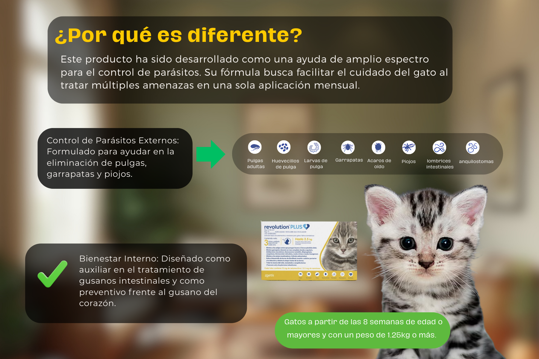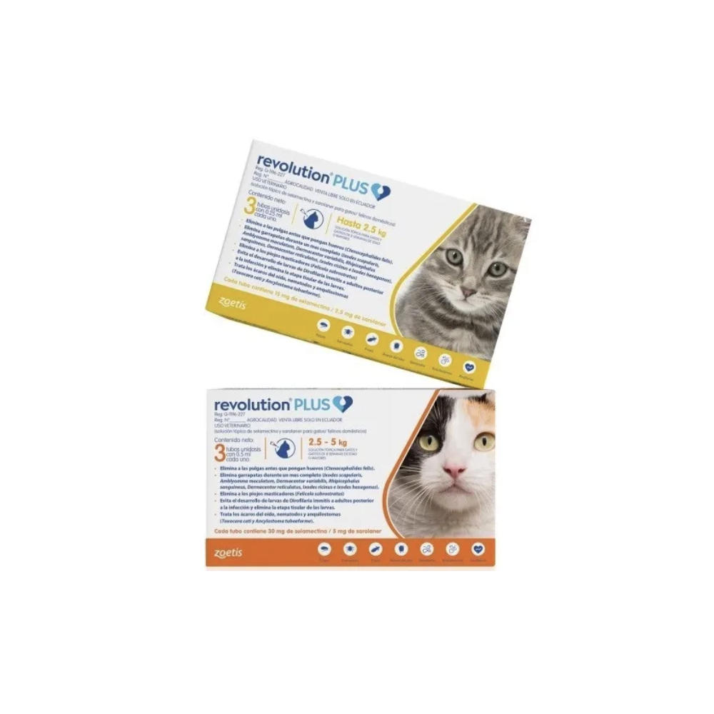 Revolution Plus es una solución tópica para gatos, que esta disponible en tubos de una dosis para el tratamiento contra pulgas, garrapatas y piojos en gatitos y gatos a partir de las 8 semanas de edad o mayores y con un peso de 1.25kg o más.