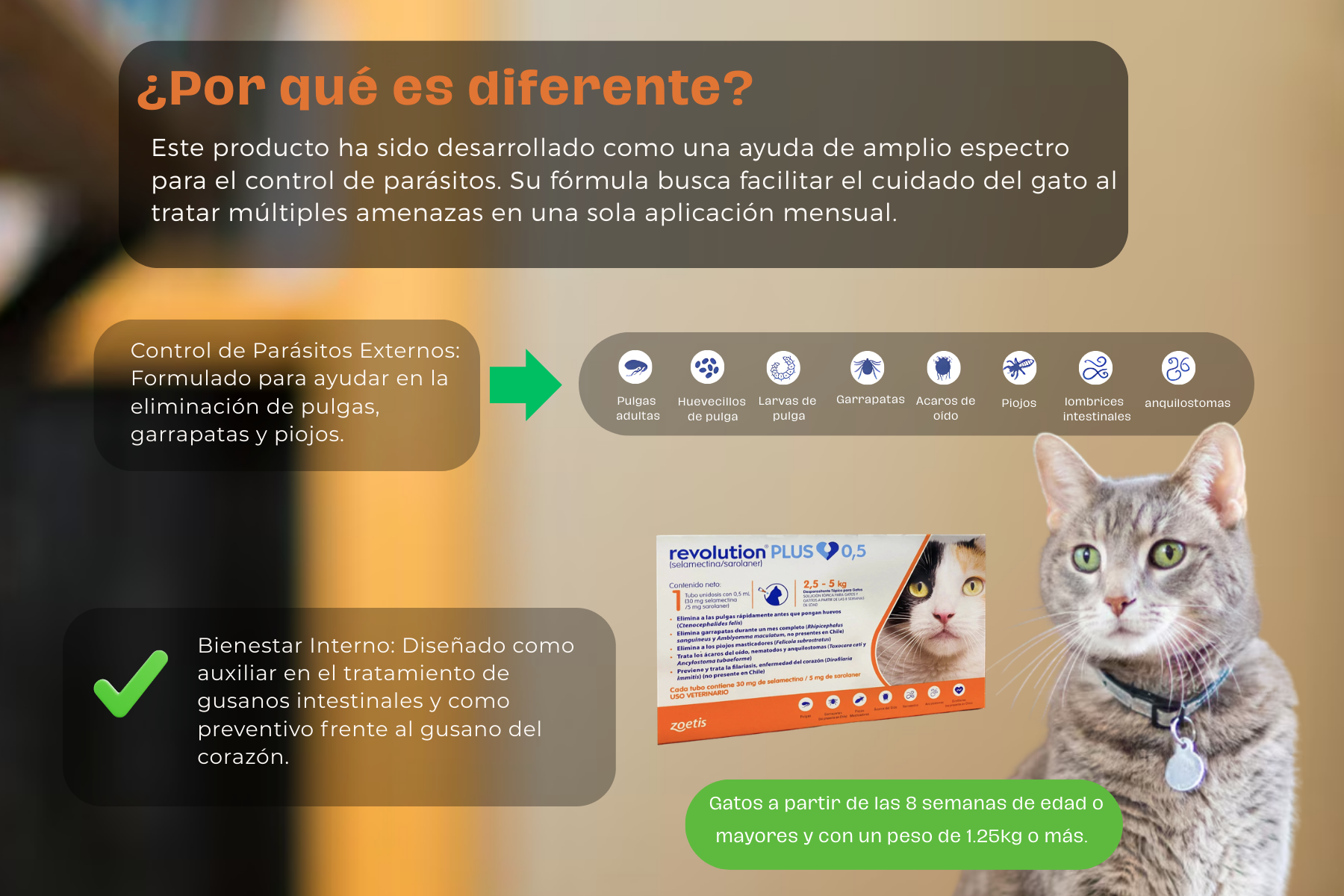 Revolution Plus es una solución tópica para gatos, que esta disponible en tubos de una dosis para el tratamiento contra pulgas, garrapatas y piojos en gatitos y gatos a partir de las 8 semanas de edad o mayores y con un peso de 1.25kg o más.
